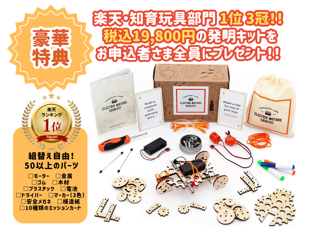 本ワークショップでは、アメリカ生まれの「ティンカリング発明家キット」を使って、子どもたちが課題解決型学習に挑戦します。「生きるチカラ」を育むために欠かせない、**非認知能力(ココロ)と認知能力(アタマ)**を楽しく養える特別な体験です。